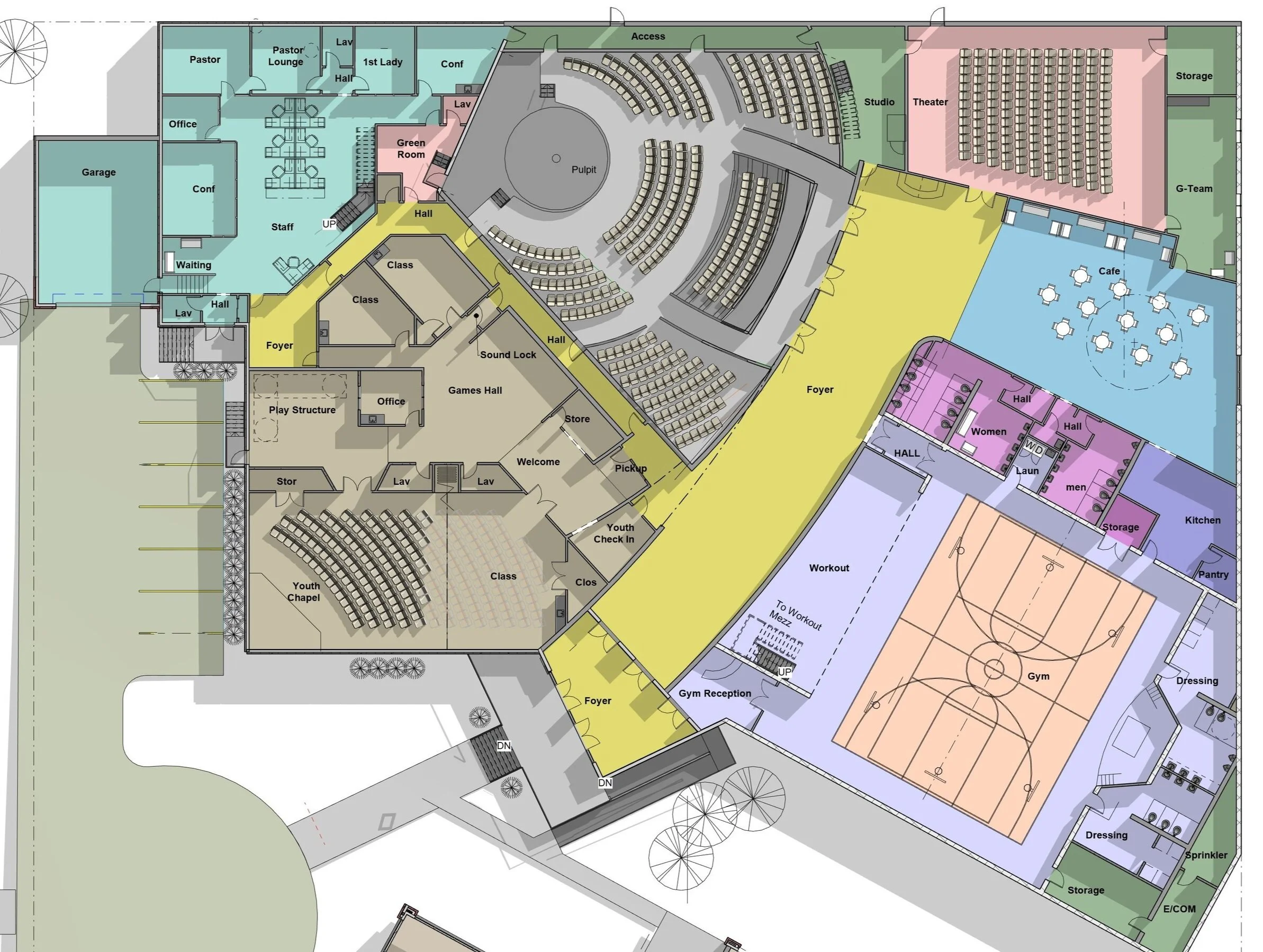 The sanctuary is designed for contemporary worship, with related gathering spaces, cafe, theater, education and gym. The spaces blend the needs and preferences of traditional and younger members. The sanctuary is designed for both an intimate worship style and the to accommodate technology features fitting the leadership’s recording industry background.